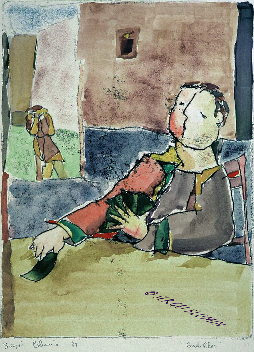 © S. Blumin, The Gambler, signed, unframed author's print of watercolor, 1987